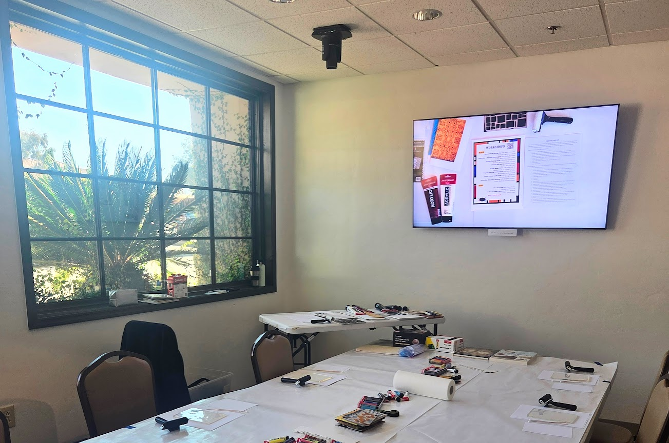 Experience art instruction like never before! The SAAG Gallery is thrilled to introduce our state-of-the-art teaching technology featuring a stunning 65" display and overhead camera system. Now every detail—from delicate brushstrokes to intricate tile and paper placements—comes to life on the big screen, giving you a front-row view of your instructor's techniques in real-time. No more craning your neck or missing those crucial moments-- you'll see exactly what's happening as if you were standing right beside your instructor. This is art education reimagined for the modern student, combining the warmth of hands-on instruction with crystal-clear visual learning. Come see the difference for yourself!